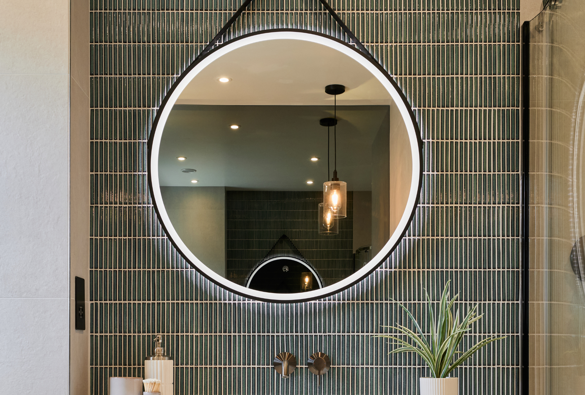 The bespoke grey tinted mirror enhances the calming and serene feel of this luxurious bathroom while adding depth to the space.