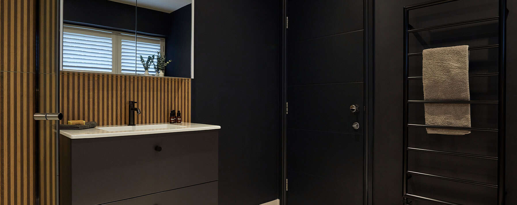 Our clients wanted a neutral space but with dark accents, without creating an overly masculine feel. Therefore, we created a dark pocket with off black paint by Farrow & Ball. This wall is only visible when in the room, adding a surprise element when walking into the bathroom. The black wall is complemented by the Dansani basin and brushed black brassware by Vado.