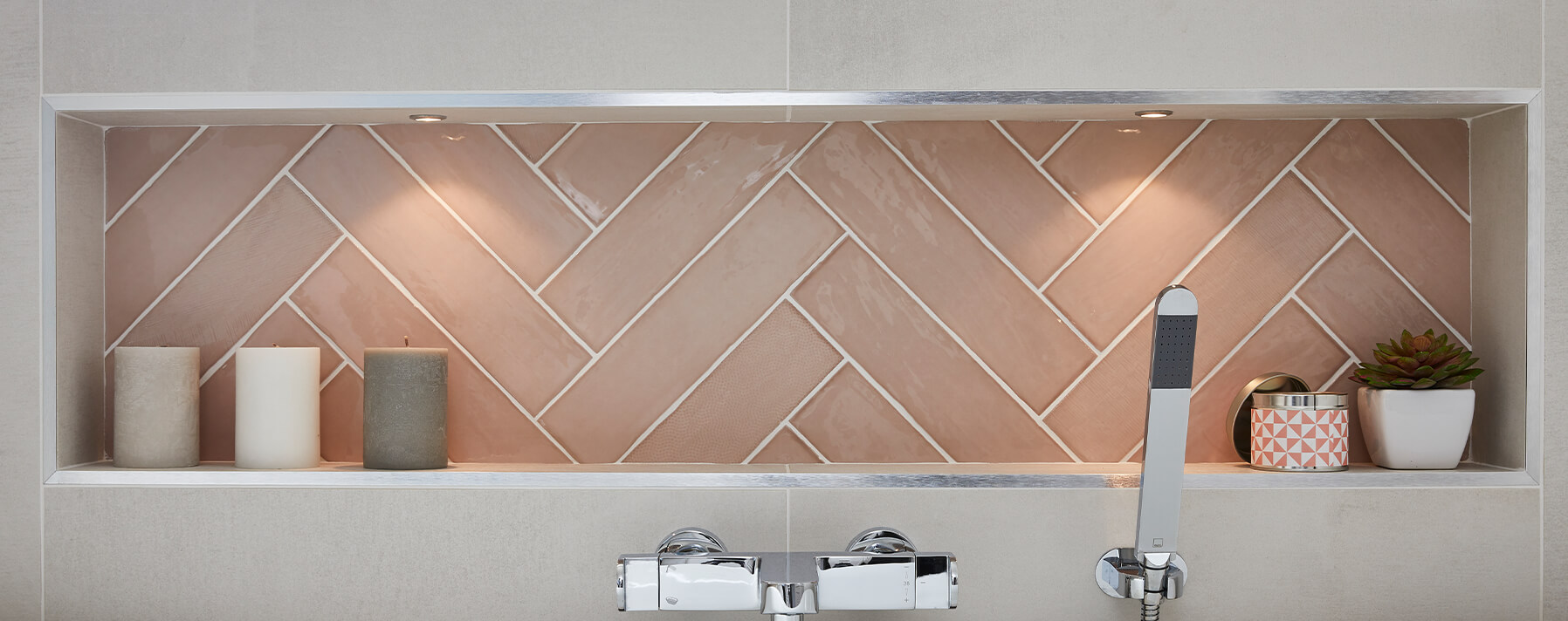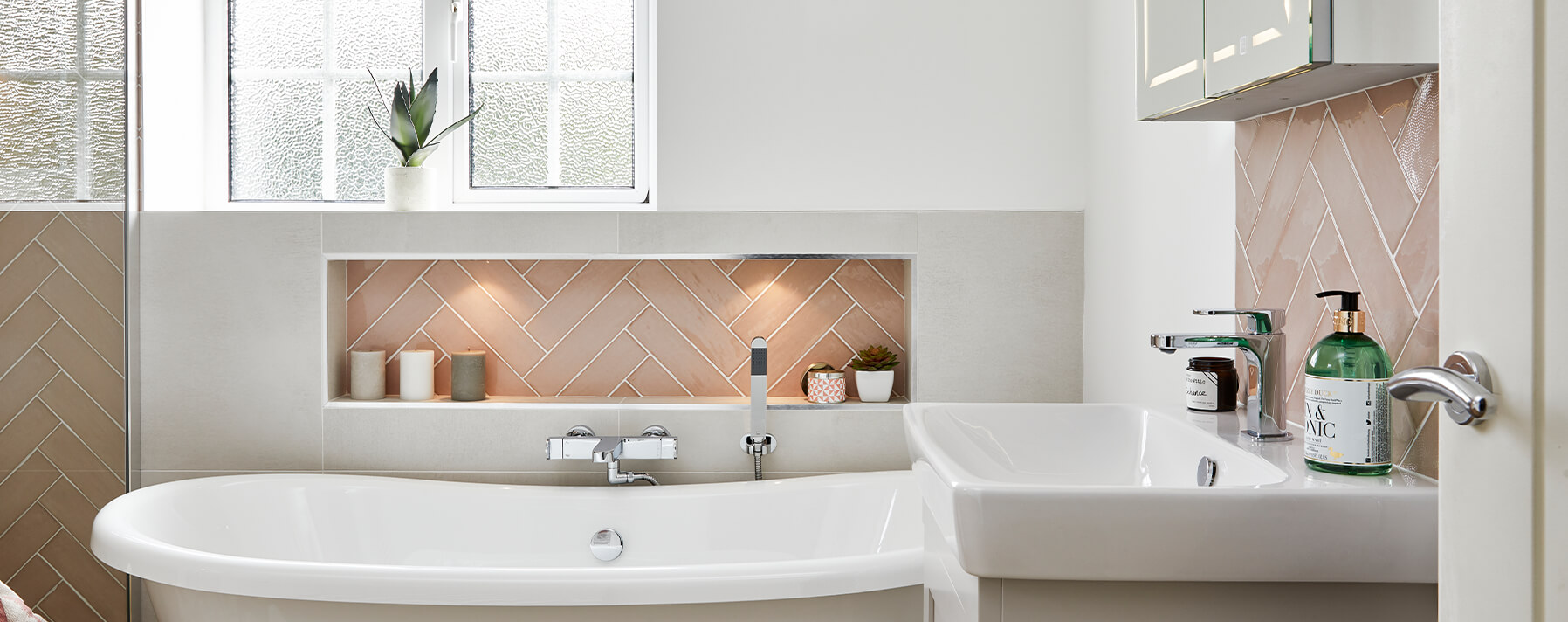 To create this look we used blush pink tiles from Porcelanosa and a bespoke basin unit from Vanity Hall. While the wetroom area opens up the room, giving a greater sense of space and light. Stylish brassware by VADO compliements the BC Designs bath and the HiB mirror cabinet adds an attractive storage solution.