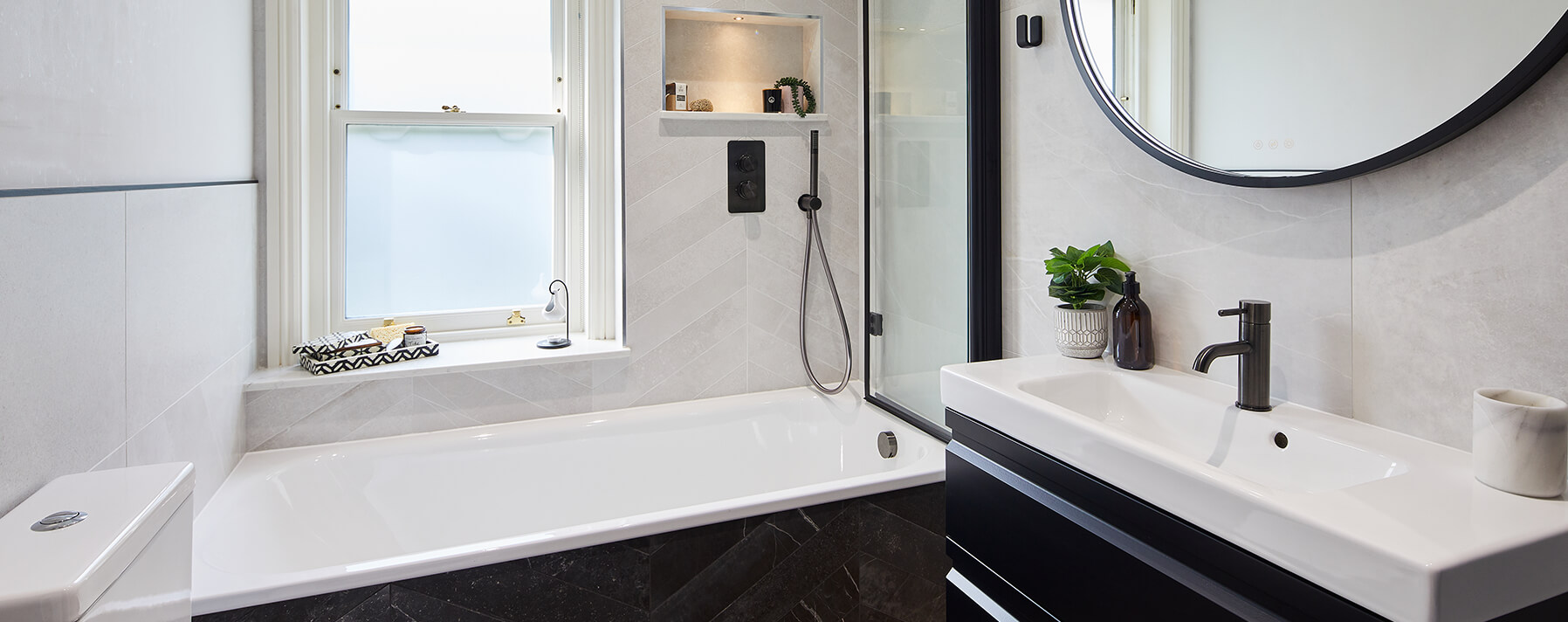 The adjustable LED light around the circular mirror (also from Dansani) helps adjust the mood of the room, along with clever lighting running the length of the bath and in the recess. The slight vein finish in the stone work on the windowsill and recess, works with both the white and black chevron tiles. Picking up accents of the colours within the finish look of the tiles.