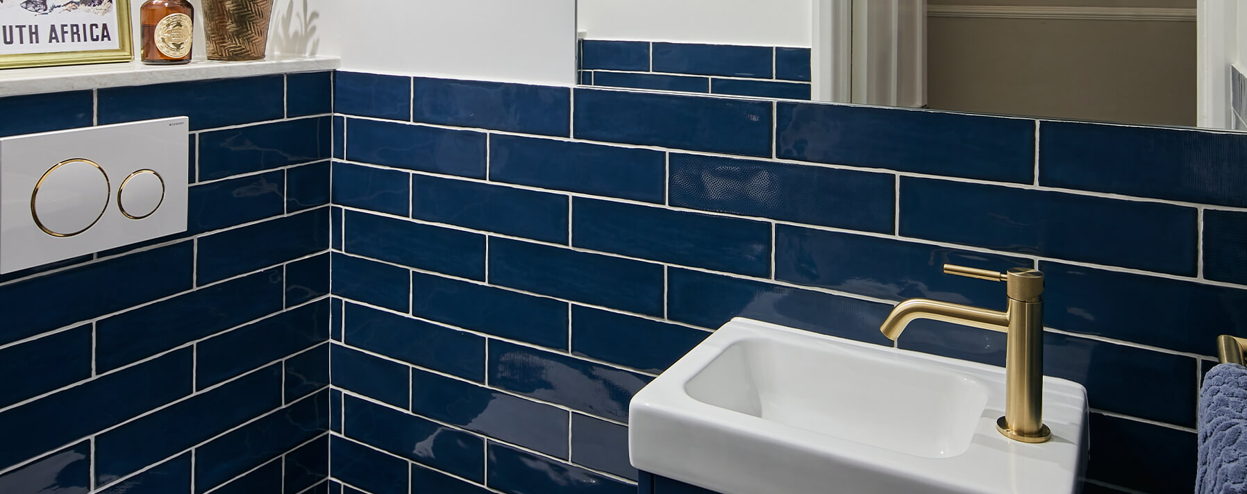 Our clients were after a statement cloakroom that offered colour and pattern, with an elegant and luxurious feel. We brought in brushed gold elements set against deep navy tones for contrast. Cuban inspired pattern tiles across the floor brings an eye catching design, drawing the eye throughout the space and complimenting the dark blue metro tiles on the wall. We topped the WC boxing (hiding the cistern) with quartz laced with a gold vein, marrying the brassware within the design. A bespoke mirror set underneath the awkward shape from the slope of the returning stairs opens up the space and brings in extra light throughout the small room.