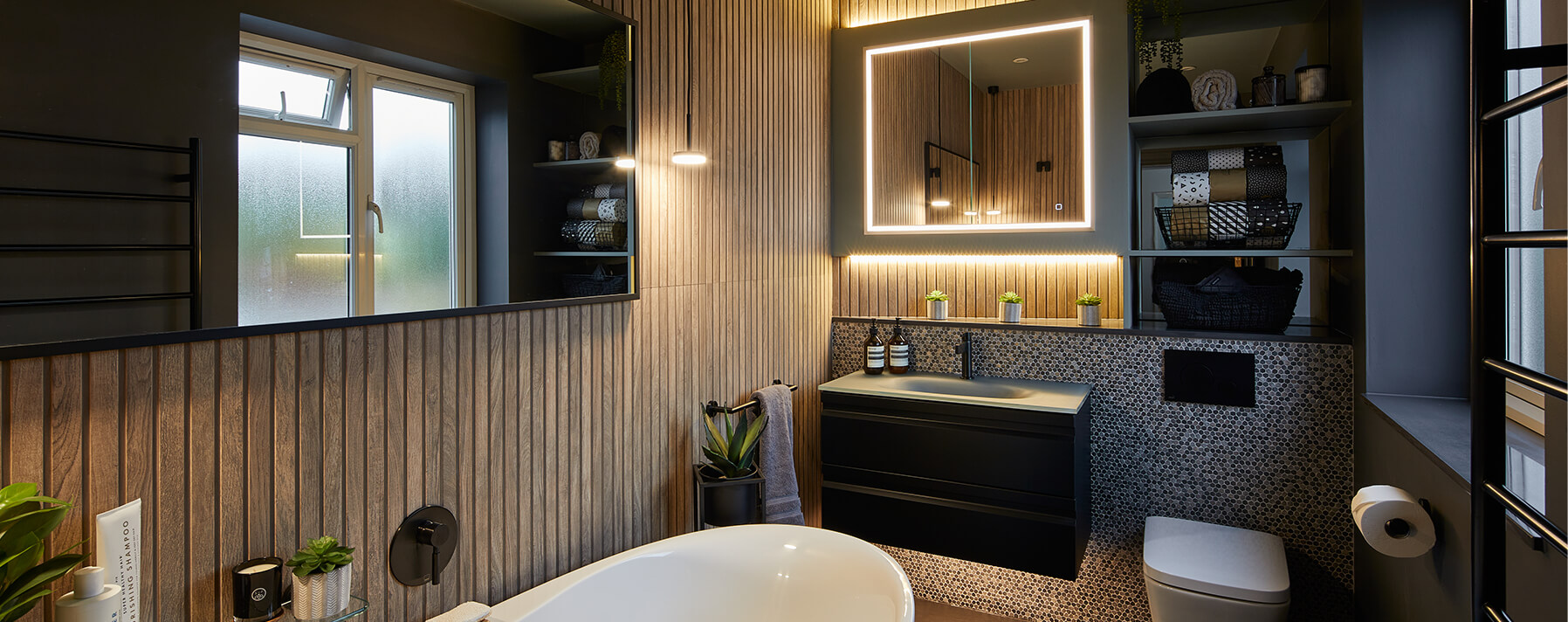 Lighting plays a big part, in creating the right feel for a room. As this is a place to relax and unwind, we used several different elements to create the Colonial feel. Recessed lighting under the basin and around the mirror cabinet add a soft haze. While the ceiling spot lights are practical as dotted around the room. Two pendant lights in matt black finish hang either side of the free standing bath, giving a low level light and a sense of drama.