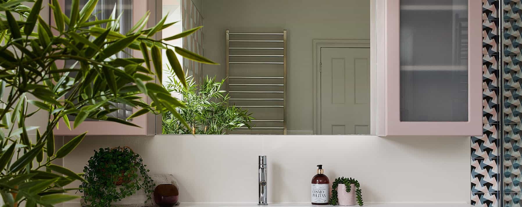 Our clients’ brief was for something colourful and exciting. They wanted to keep the existing basin unit, mirror and top cupboards, but the light grey colour of the cabinets didn’t work with a beige worktop and it was in need of an update. To complement the tiles in the shower area and bath surround, we painted the unit a soft blue called Bone China and the top units in Light PeachBlossom, both by Little Greene. We added shaver sockets within the units, keeping the counter area fuss free.