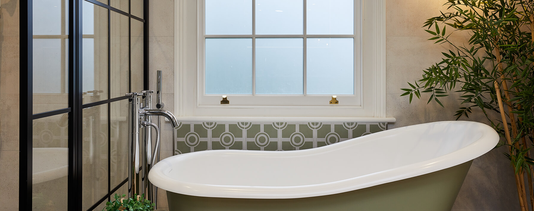 For an updated classical look, we used a walk in shower with a black crittall frame by Drench. A slipper style bath with exposed feet – finished with a green Farrow & Ball paint called Lichen. The classic radiators add a practical grandeur to the look, while keeping towels warm. The shaker style furniture fits neatly within this older property in Hampton Wick, while pattern tiles and pendant lights give a fresh modern twist.