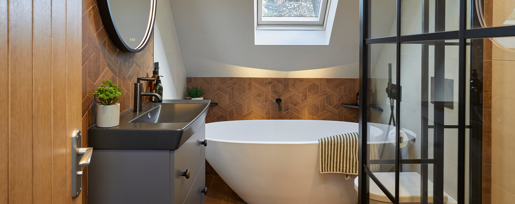 The offset stone bath from Ashton & Bentley, creates a sense of space with the curved ends. Allowing extra floor around the base to be visible, which gives the illusion of a wider space. This is contrasted by the mansion weave wood effect tiles on the lower wall, and board style planks on the floor.