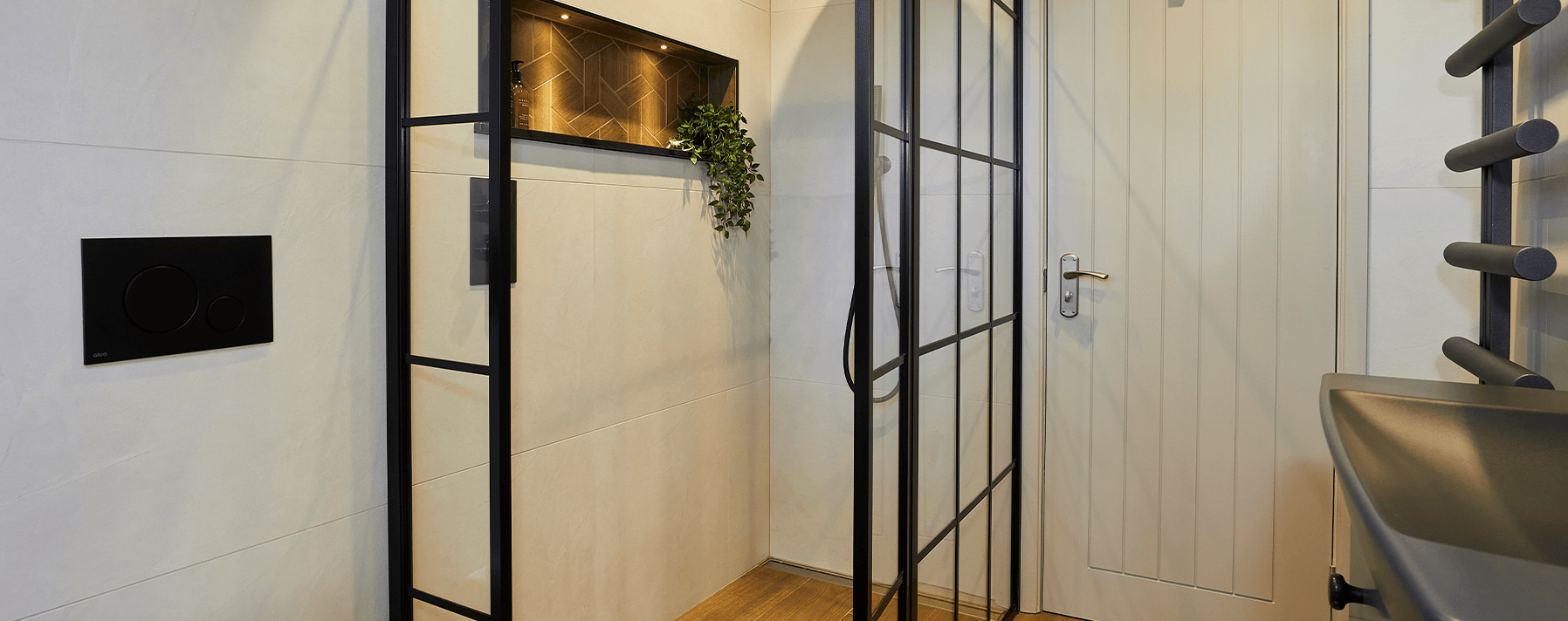 A black crittall shower screen creates a dramatic yet sleek element to the design. A wide recess shelf with spot lights creates a calm layered effect, while maintaining a tranquil and fuss free look. It is also very practical and negates the use of wire baskets protruding into the shower space.
