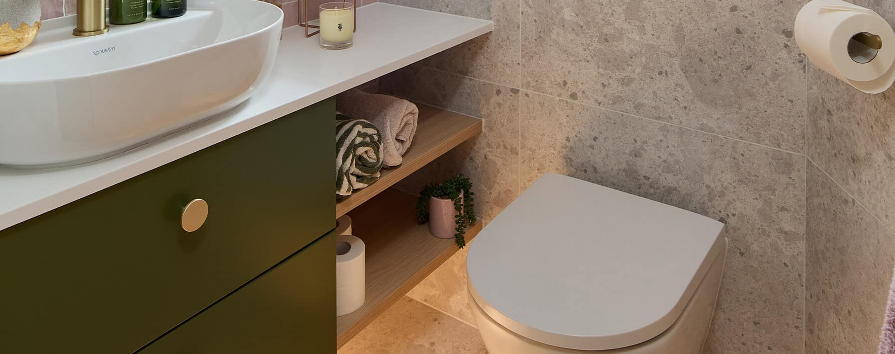 We designed the space with storage in mind, using a vanity unit by Dansani. Utilising the full length of the room while creating a calm and spacious feel. The unit is finished in bespoke olive green, which grounds the variations of pink in the zellige inspired tiles.
