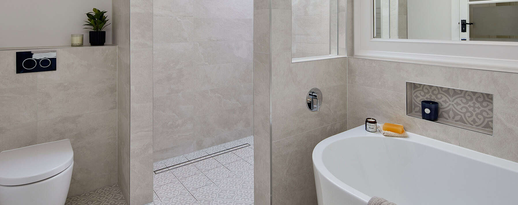 We used soft tones with the tiles. Using a plain tile on the walls and a soft pattern tile on the floor and inside the recessed shelves. Giving a Romanesque feel to the design – particularly within the open wetroom area. This is enhanced by the skylight above the shower – flooding the area with light.