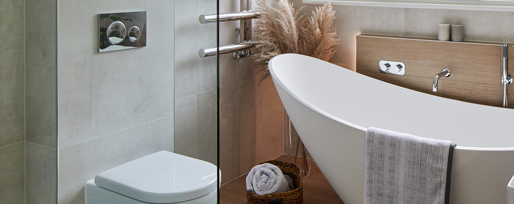 Within the recessed shelves, in the shower areas and above the WC, we used Carter Ecru tiles by Ca ‘Pietra. This creates a depth and works with the Metroplitan Caliza tiles by Porcelanosa. A frameless wetroom panel screen by Matki keeps the room sleek and fuss free.