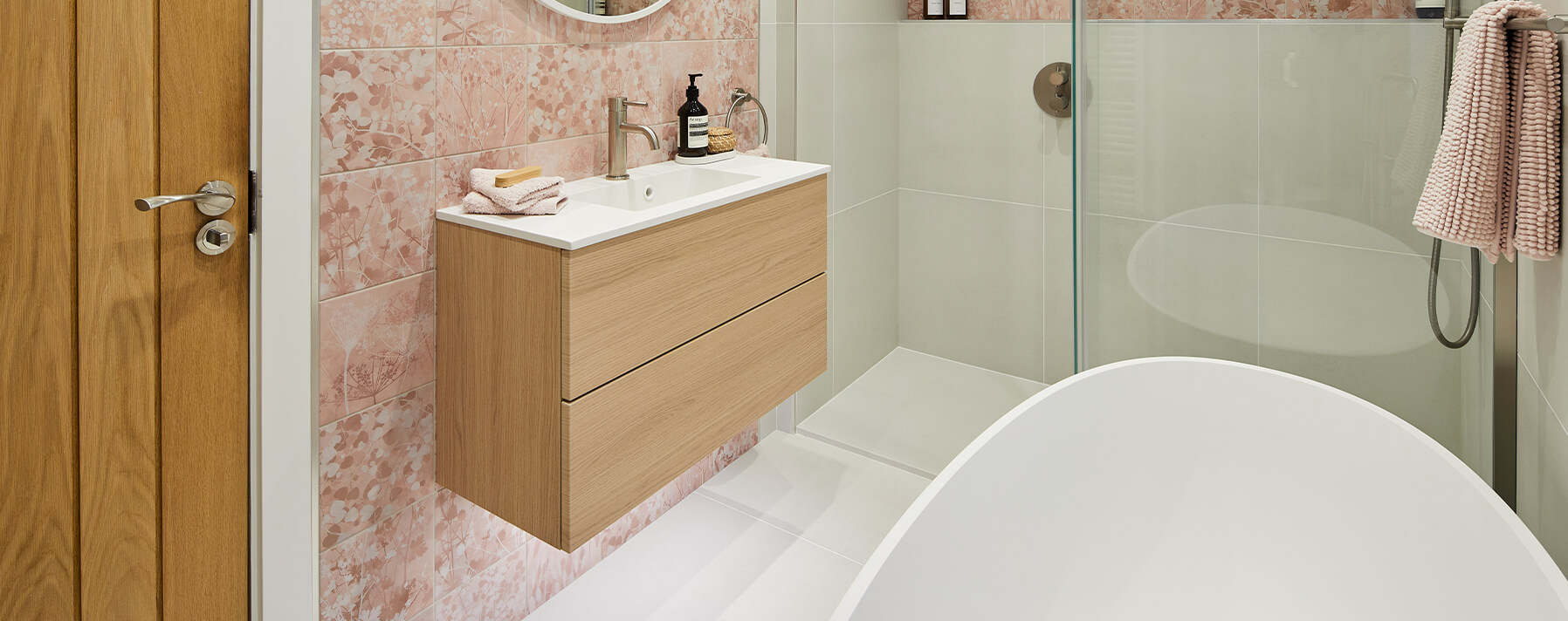 We placed a freestanding bath by Ashton & Bentley up towards the middle of the room. Creating a seamless design with a floor standing bath tap in brushed nickel. This allowed plenty of space for a walk in shower. A recessed shelf hides the pipe work, and provides a shelf for shower bottles to be easily accessible. The main body of the room is tiled with large format Bianco matt tiles by Minoli. With the recessed part in wild botanical pink tiles by Ca ‘Pietra, bringing a meadow feel to the design.