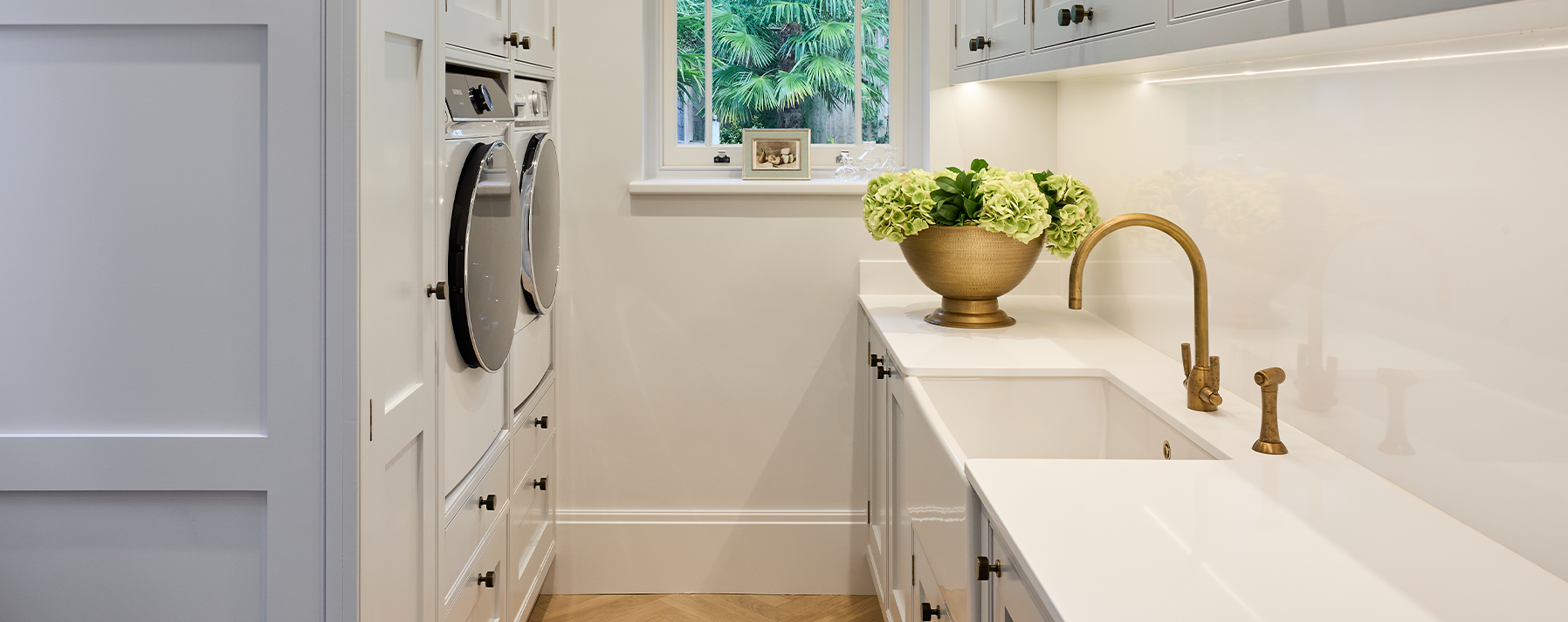 The handmade floor adds a luxurious feel and unites the three zones, leading from the kitchen and dining area, into a compact yet perfectly organised and streamlined utility room. Again, we utilised every inch of space to maximise the area while creating a streamlined and organised space.