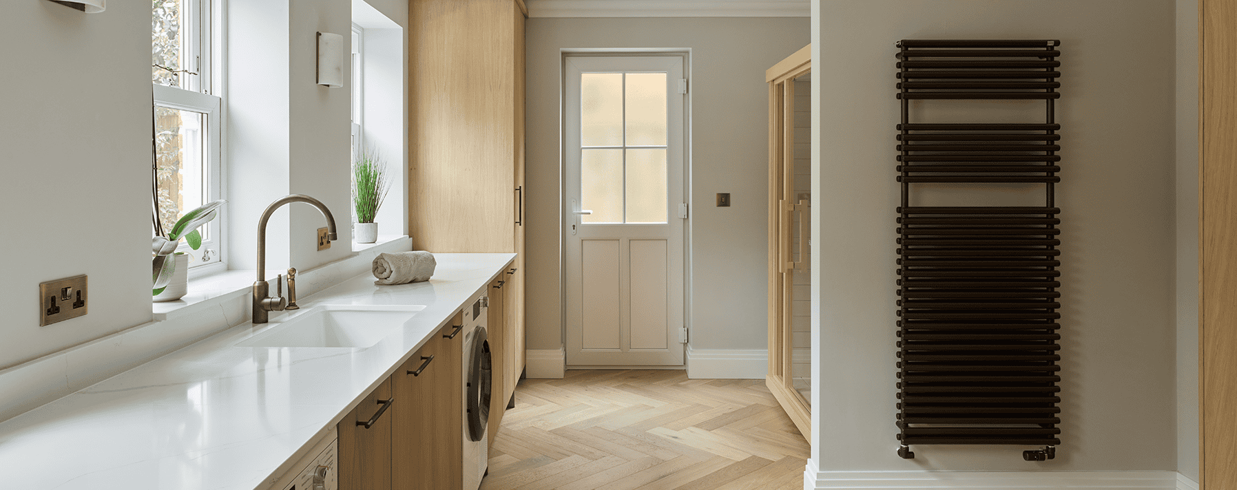The coffee station is another clever way to keep the open space fuss free and tidy. As is the integrated Miele dishwasher, expertly hidden behind the fluted wooden façade. Chocolate bronze Edgbaston handles from Armac Martin completes the design.