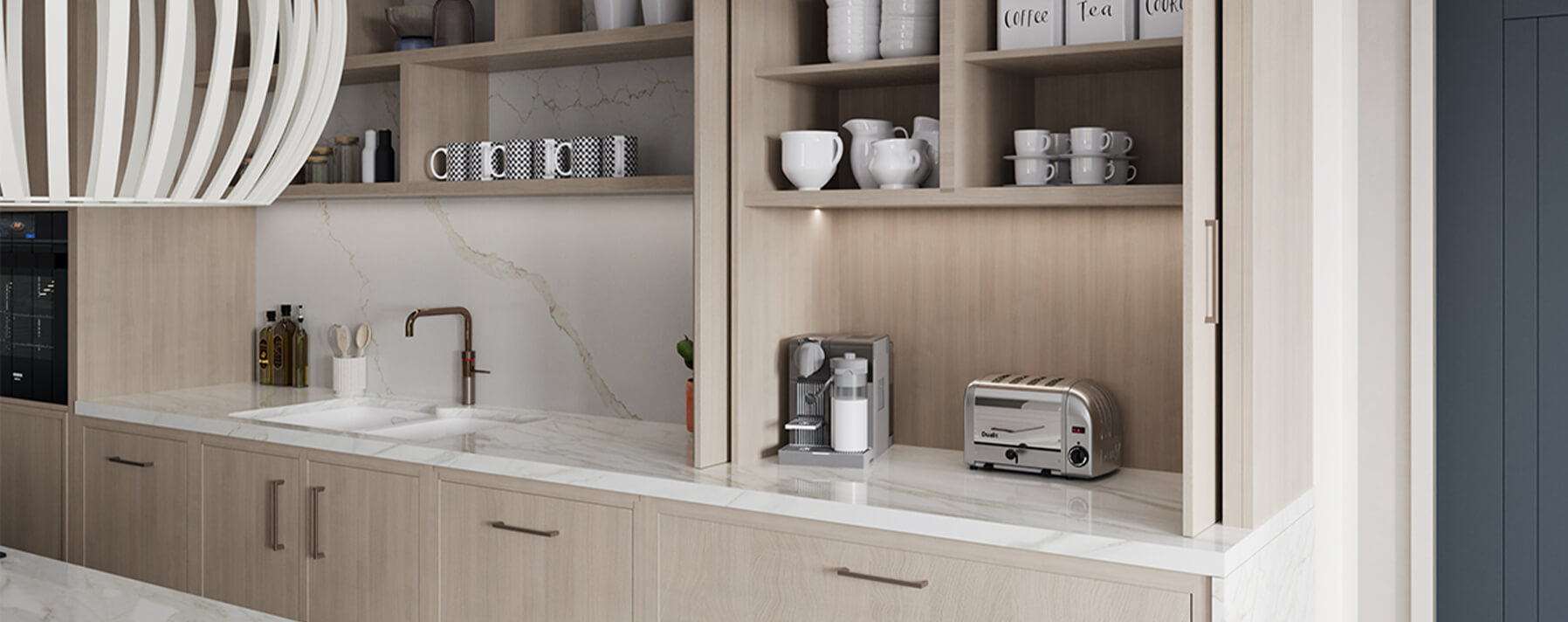 A hidden pantry, disguised as full height cupboards, delights with open storage and easy access pull out baskets. With an extra work top, allowing our home owner to have plenty of areas to prepare when entertaining guest.